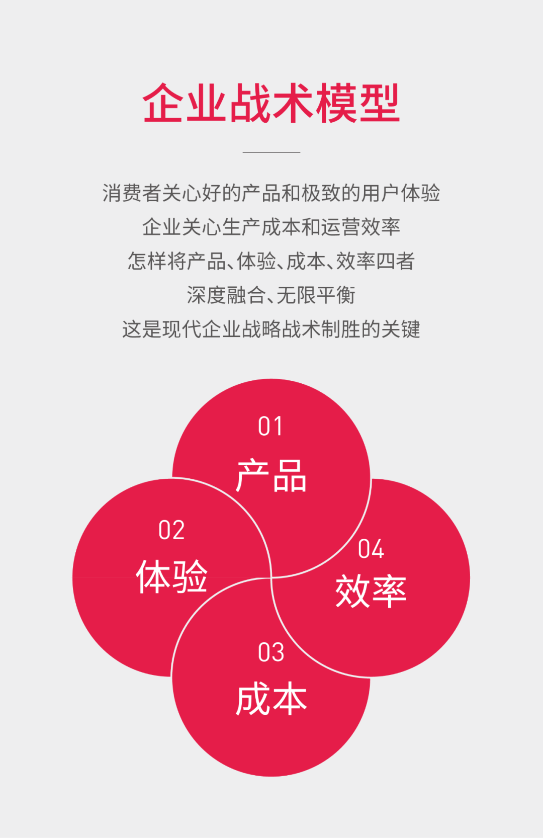消費(fèi)者關(guān)心好的產(chǎn)品和極致的用戶體驗(yàn),企業(yè)關(guān)心生產(chǎn)成本和運(yùn)營效率,怎樣將產(chǎn)品、體驗(yàn)、成本、效率四者深度融合,無限平衡,這是現(xiàn)代企業(yè)戰(zhàn)略戰(zhàn)術(shù)制勝的關(guān)鍵。